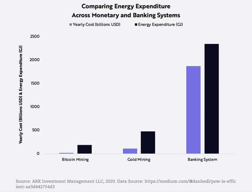 No tweet publicado podemos ver um gráfico, preparado pela ARK Investment Management. O mesmo faz comparação do consumo atual de energia da mineração de bitcoin com o da mineração de ouro, ou banco tradicional.